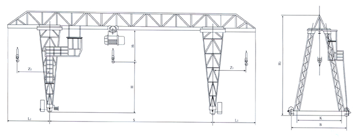 本機是與CD1或MD1型電動葫蘆配套使用,適用干露天作業(yè)的固定跨間,本機禁止吊運熔化金屬及易燃、易爆物品,根據(jù)用戶要求還可制成單端外伸懸臂式或無懸臂式結構。